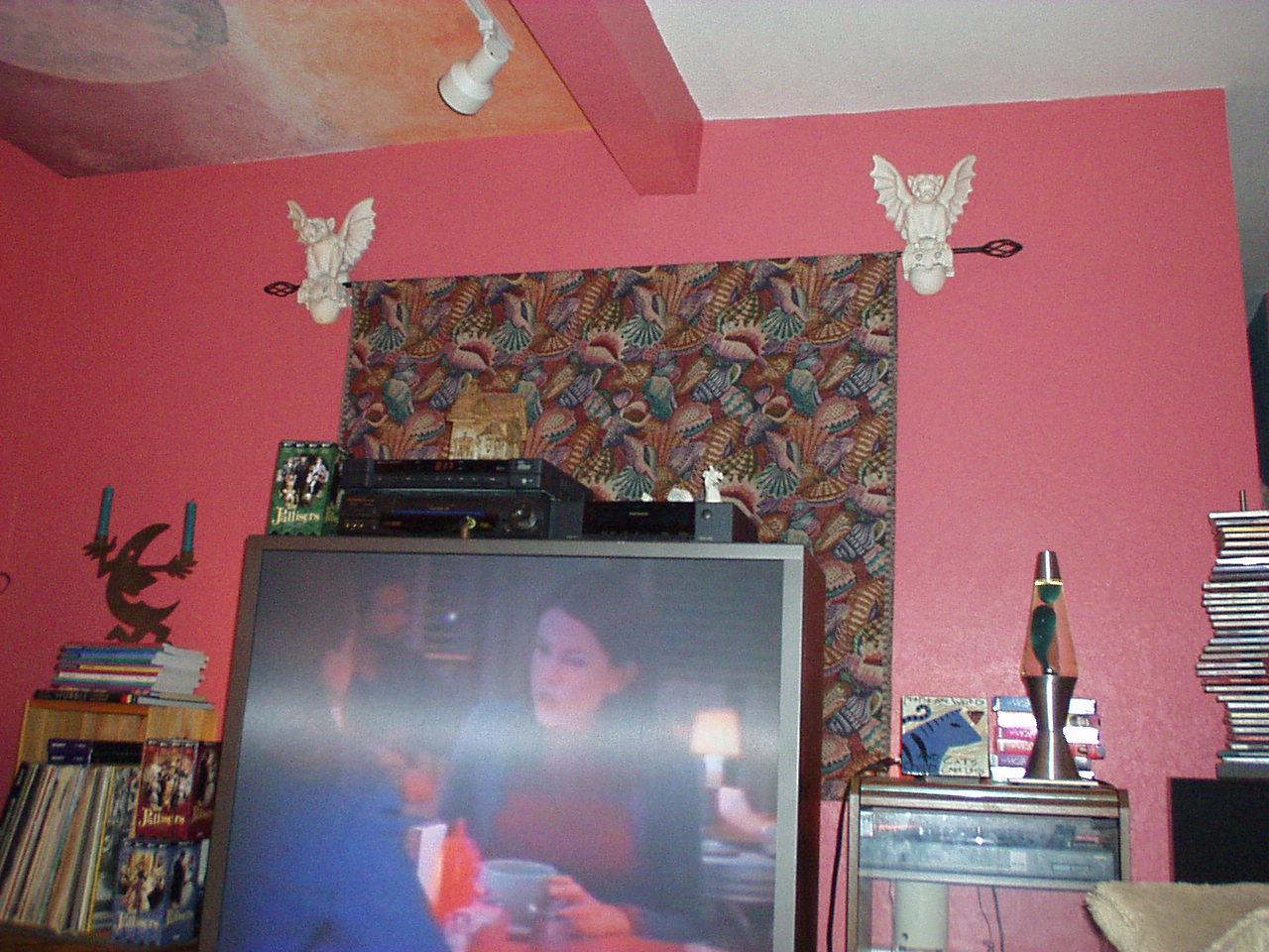 The gargoyles that you see here were originally bought to hold swagged curtains in our house in Maryland. The tapestry they hold here is leftover fabric from the reupholstering of our Victorian sofa. The tapestry hides a hole in the wall originally meant for the chimney of a Franklin stove. |