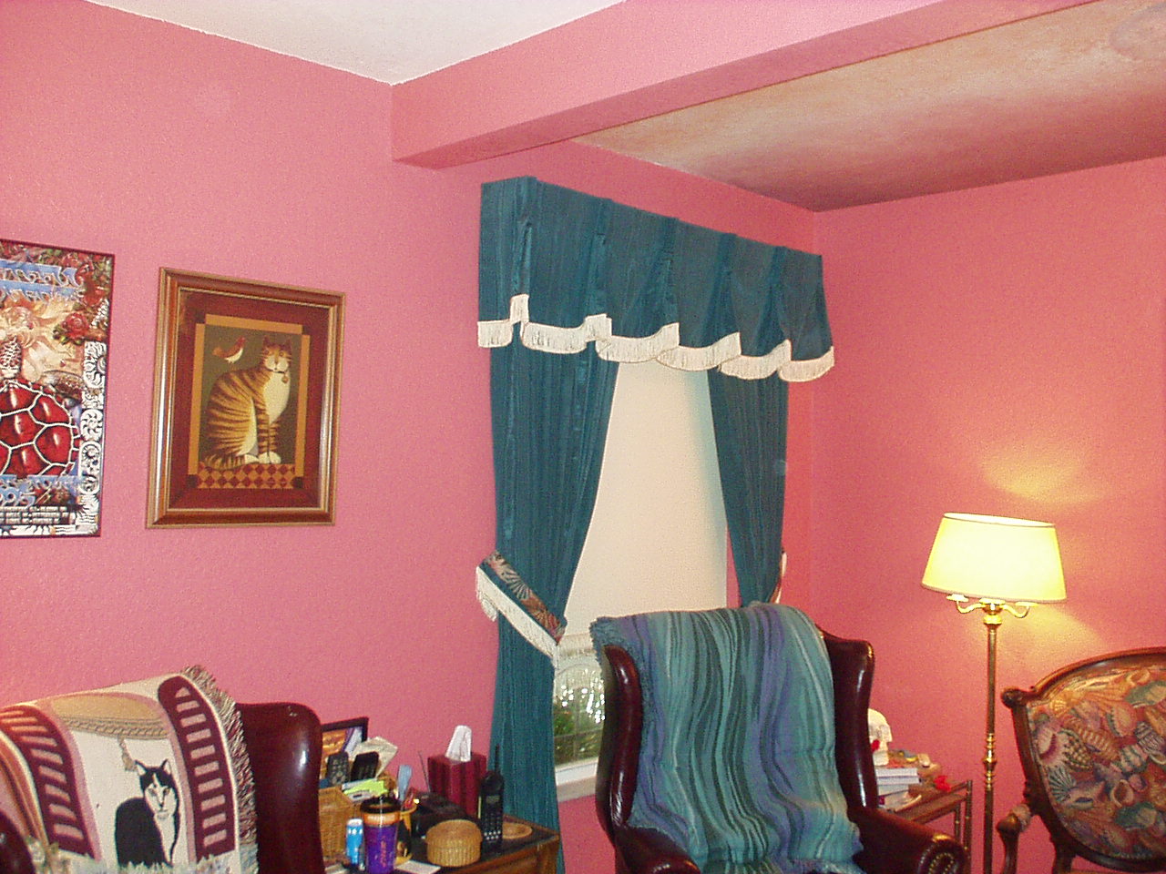 The first thing we did after we moved in was have curtains made for the ground floor, in the style of neo-Victorian bordello. We originally wanted the curtains to be made of velvet but, aside from velvet being WAY too expensive, we're also cat lovers. . . . |