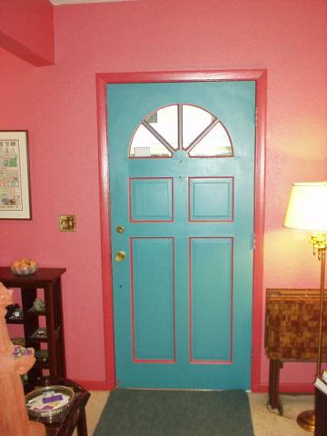 This is our front door. The blue is the same blue used in our dining room and in Area 51, while the "watermelon" color is the same as that on the woodwork.