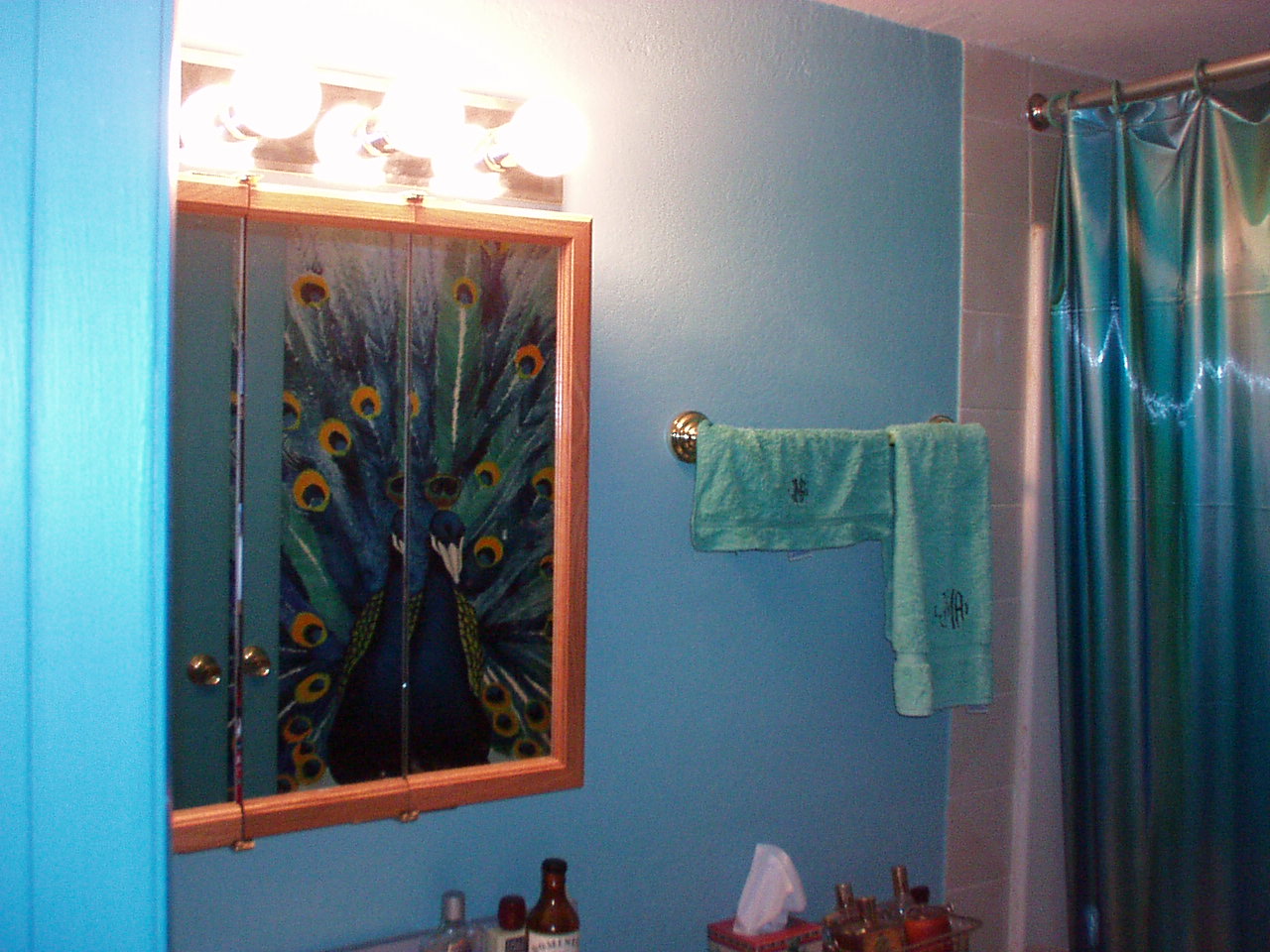 Our ground-floor bathroom has a floor-to-ceiling expanse facing the toilet, onto which we had a painting painted. This photo, taken from Area 51, shows the painting reflected in the bathroom mirror; the next photo will show the painting itself.