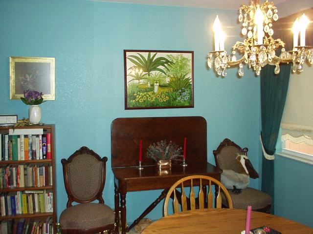 The two Victorian chairs in this picture are part of the set that includes the loveseat in our living room, and once belonged to Mary's paternal grandmother. The drop-leaf table we're using as a sideboard was originally Grr's kitchen table, refinished by Mary's father in the late 1940s. (The fifth leg, seen below, broke in a move in the 1970s. Some day Mary will get around to fixing it. . . .) |
