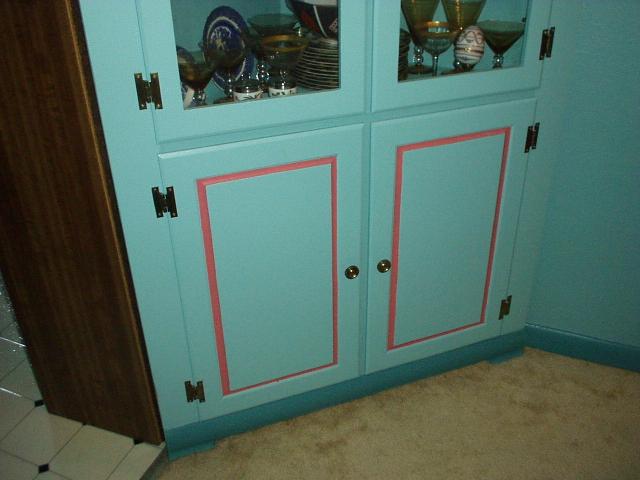 Here is a closeup of the hutch doors, showing the living room's watermelon pink more clearly. The hutch backs up to a rather boring bookcase in the kitchen; both of them are where they are to make the nine-foot opening between the kitchen and the dining room a little narrower (i.e., easier to screen off for dinner parties). |