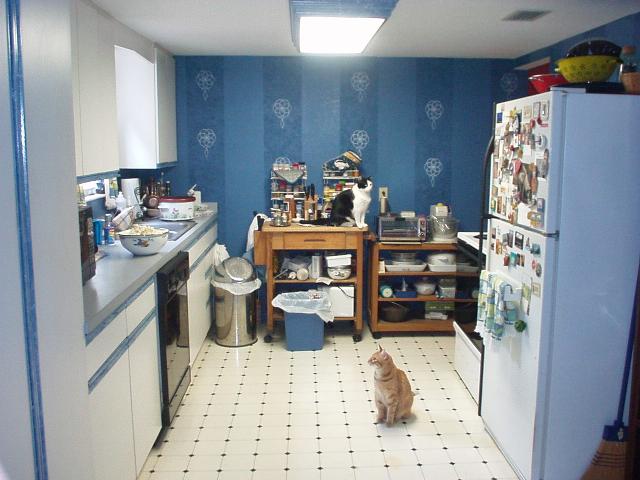 This is our kitchen; Mary took this photo standing in the same spot where she stood to take the overall shot of the dining room a few photos back. What appears to be wallpaper is actually a faux finish, based on a trivet that Mary was given many years ago, and upon which Miss Annabel is sitting. (On the kitchen floor, Henry is contemplating a bowl of popcorn he hopes to have some of.) |