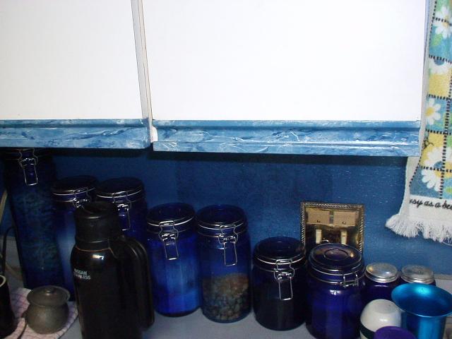 Here's a closer view of the faux marbling on our cabinet handles. Behind the canisters you can see the same striping as behind the stove.