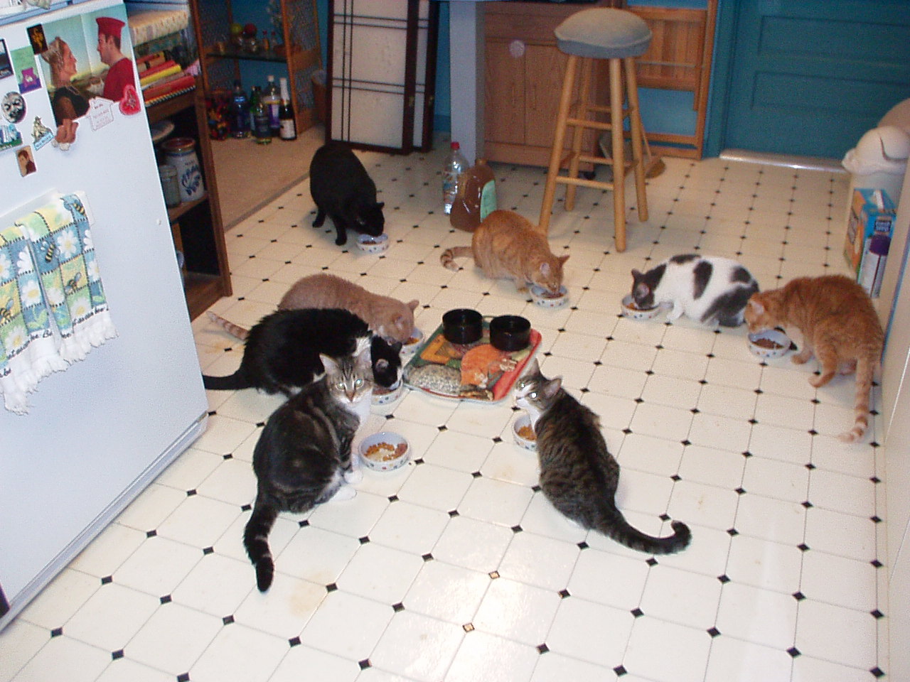 Yes, we are demented enough to have eight cats. We KNOW that's too many but how do you resist when a stray puss looks up at you and says, I'm hungry? Starting from the far right (the orange puss to the right of the piebald puss) and working our way around counterclockwise are Abby (orange), Patience (our little soccer ball), Henry (orange), Finny (Phineas Finn, black), Biscuit (biscuit-colored), Annabel (mostly black), Hobbes (watching the camera), and Sophy (with very glowing eyes). Sophy usually finishes eating first and then waits to scavenge from other bowls, usually starting with Finny's. |