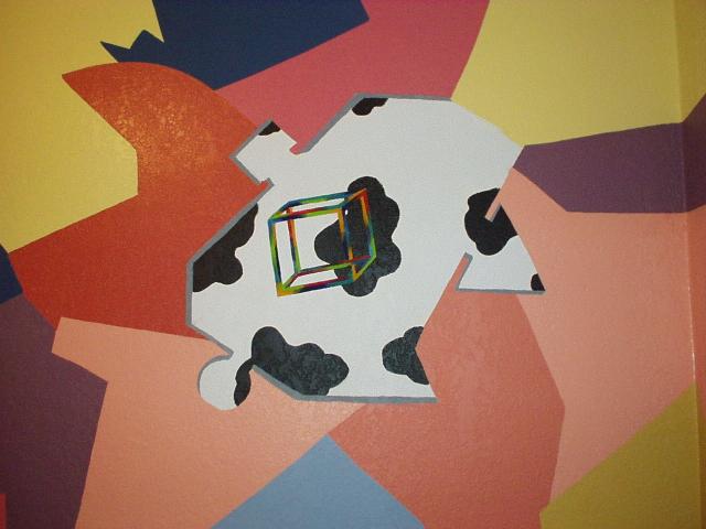 This puzzle piece is in the northeast corner of our guest room, on the north wall. It's a little hard to make out in this photo, but the cube is one of those impossible-in-the-real-world drawings that Escher was so good at dreaming up.