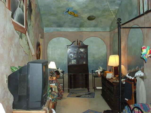 We consider our master bedroom the house's pièce de résistance it took more than a month to complete, including the rental of special scaffolding to get to the top of the 14-foot ceiling. The room is an unusual shape, 22 feet long and 9 feet wide, but luckily with a 4'x7' niche into which we can fit about half the bed. This photo was taken from the north end of the room. |