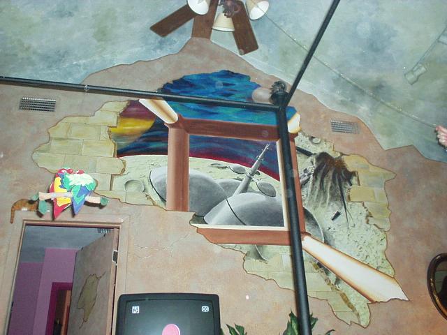 Both Jerry and Mary love lying in bed and looking at this mural, which takes up most of the east wall of our bedroom. When we started out, all we had really envisioned was a ruined citadel with its roof missing. Brian wanted a crashed spaceship on the far right. We compromised on a crashed Shadow ship (the bad guys of Babylon 5), being salvaged by a vehicle from the Star Wars universe. The orchid-colored room beyond the door is the master bathroom, with a second door leading to the guest room and library. |
