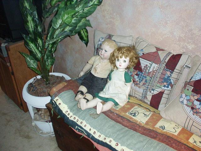 Charle and Melinda again. The fake diffenbachia was a gift from Mary's mother, who thought we might use it as a litterbox. We put some soft cushions and a heating pad into it instead, and our old lady, Abby, loves to snuggle there you can just make out her flank and tail in the opening. |