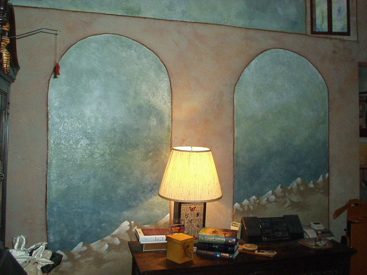 This is Jerry's dresser, a hand-crafted Mexican piece that Jerry picked up for a song in the 1960s. At the far left you can see a sliver of the Jefferson secretary you saw in the first photo of our bedroom; at the top right is one of the windows above our bed. This is the west wall of the room; the mountain range continues sloping downward across the south wall of the room. |